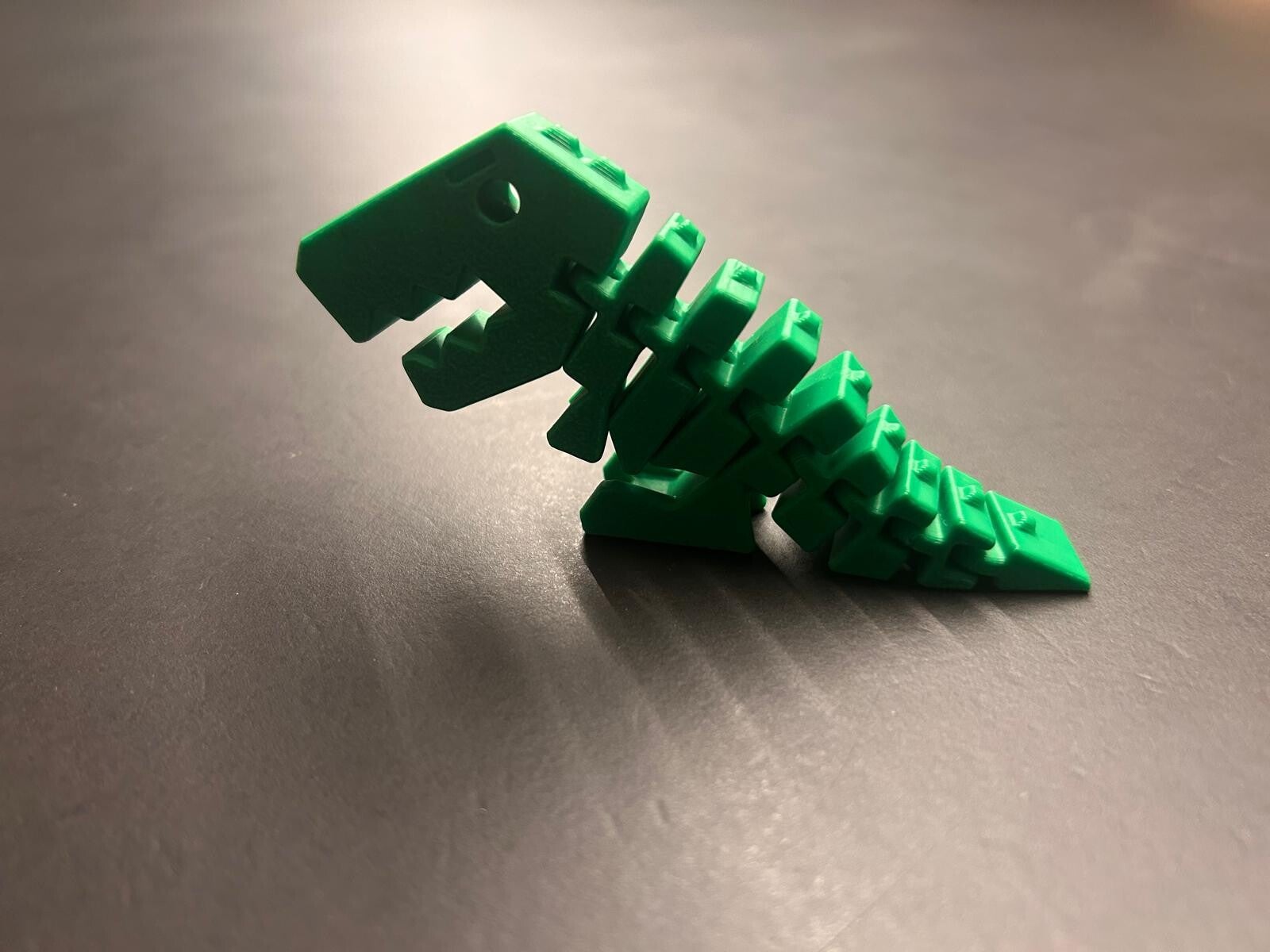 Ein kleiner Dino der aus dem 3d Drucker kommt.